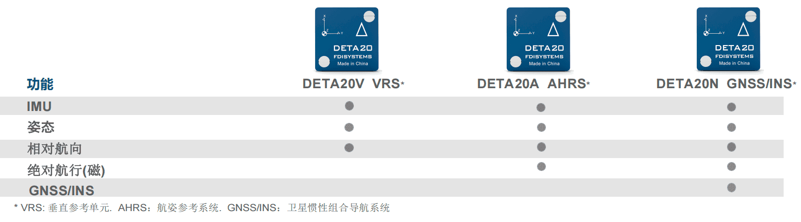 FDIsystems 推出了DETA20*系列一套完整的基于mems的工业级微型惯性导航系统。该系列的特色是采用冗余传感器技术,融合了一颗零偏稳定性为2°/h的航向陀螺仪,主要解决航向漂移的问题。 该系列包括IMU、VRS、AHRS和GPS/RTK/INS解决方案,采用坚固的金属外壳和军工级接头。搭载行业先进的SPKF非线性数据融合算法,经过专业的校准和-40℃~60℃温度误差补偿,算法具有抗磁干扰的能力,功能强大的界面软件方便即刻上手。该系列特别适用于无人机、地面自主车辆、AGV/AMR等移动机器人应用。DETA20系列产品内置在一个全新的,微型,高性能,经过的严格的出厂校准的IMU核心。V系列输出姿态和高精度的相对航向角以及校准后的IMU原始数据,A系列提供完整的航姿参考功能和带有磁辅助后的绝对航向角,N系列提供了通用的协议接口,允许用户根据目标应用接入GPS、北斗、里程计、气压计等传感器,具有速度和位置输出。