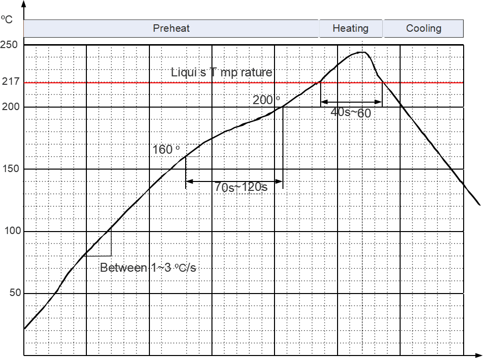 推荐的回流焊温度为 235~245ºC,最高不能超过 260ºC。为避免模块因反复受热而损坏,建议客户在完成 PCB 板第一面的回流焊之后再贴模块。保证模组朝上放置,推荐的炉温曲线图如下所示: