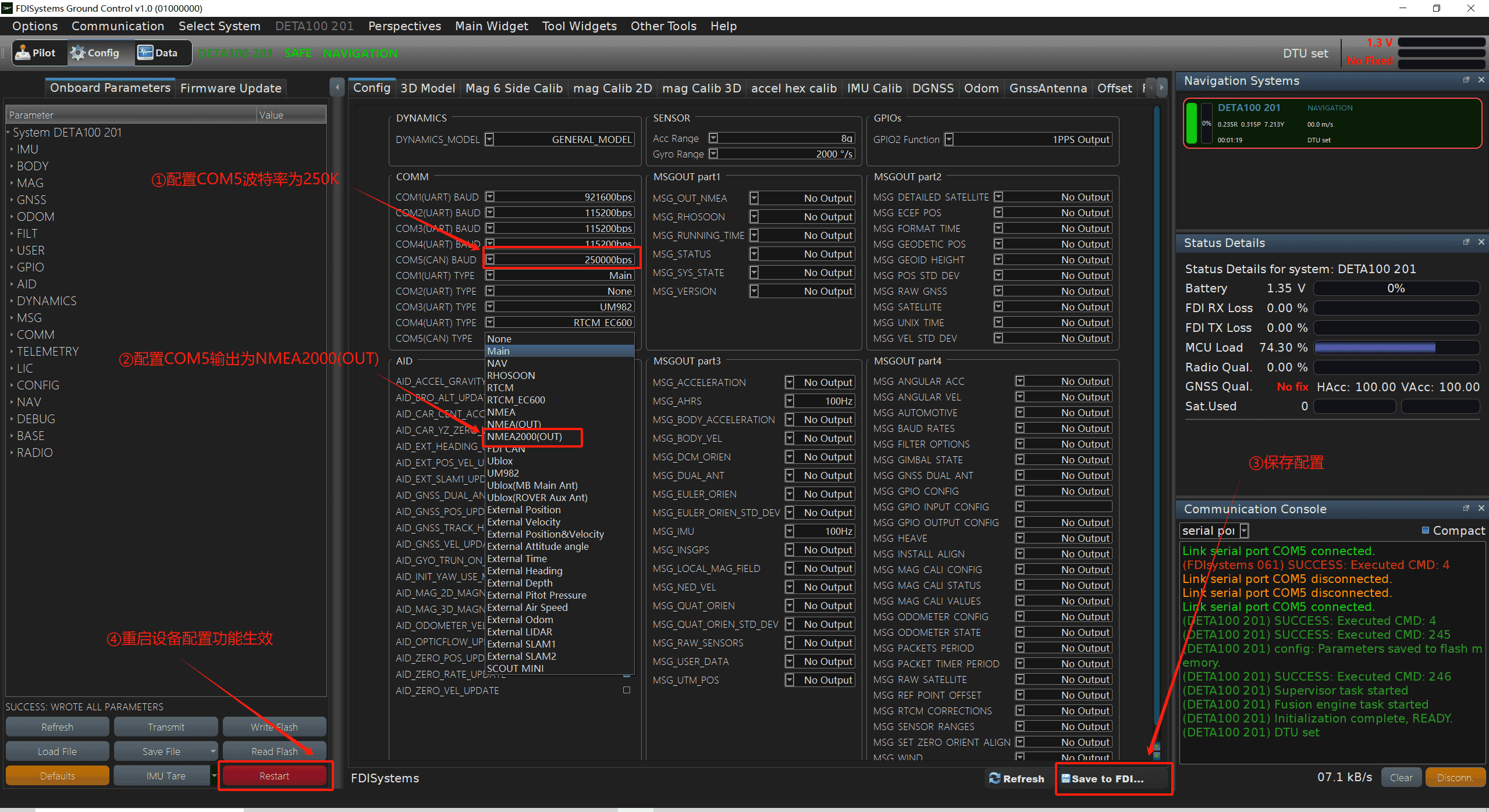 ① 由于我司产品的CAN总线上允许挂载多种基于CAN硬件的通信协议,所有如果需要使用特定的NMEA2000协议通过CAN总线输出,则需要通过上位机配置,保存重启后对应COM口功能生效。