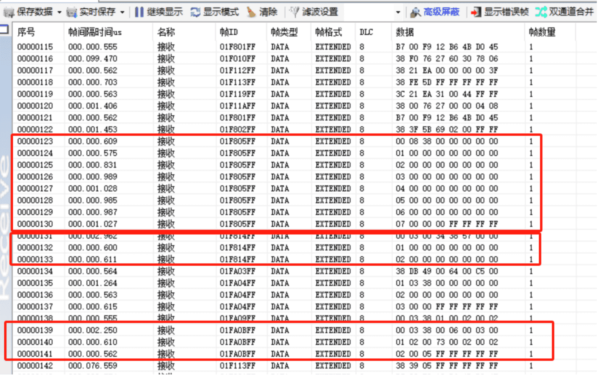 1 126992 0x01F010FF UTC时间 1 8 250K 单帧