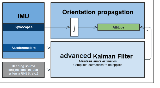 它使用垂直参考(重力)来稳定IMU。陀螺仪数据与卡尔曼滤波器加速度计的重力测量值融合在一起,以提供横滚角和俯仰角。对于航向计算,可以使用辅助传感器来稳定航向,例如磁力计或双天线 GNSS 输入。