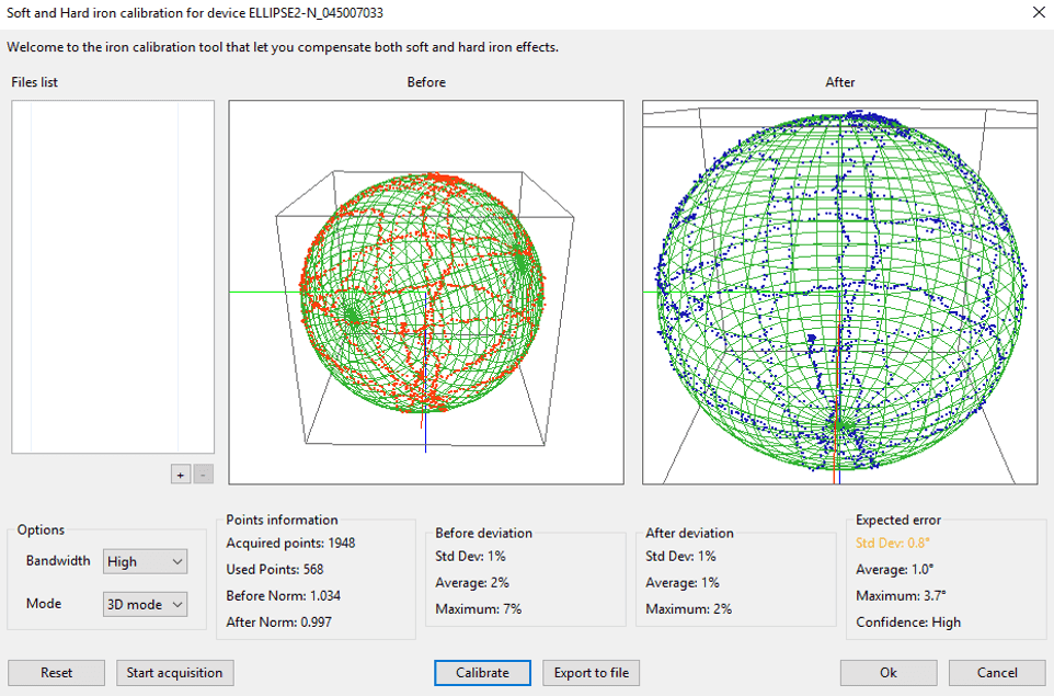 理想情况下,这些点应绘制一个完整的椭球体形状。用户必须尝试覆盖此椭球体形状的最大范围才能获得最佳效果。校准后,所有方向的磁场范数应等于1.0。在这种情况下,校准后的所有点都应放置在单元 3D 球体上。