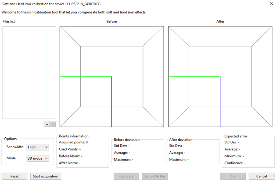 - 偏差前:每次按下校准按钮时都会更新此信息。它在校准前告知局部磁场的扭曲情况。平均偏差代表磁场。 STD Dev 定义了观察到的噪声,最大偏差表明环境的噪声程度。