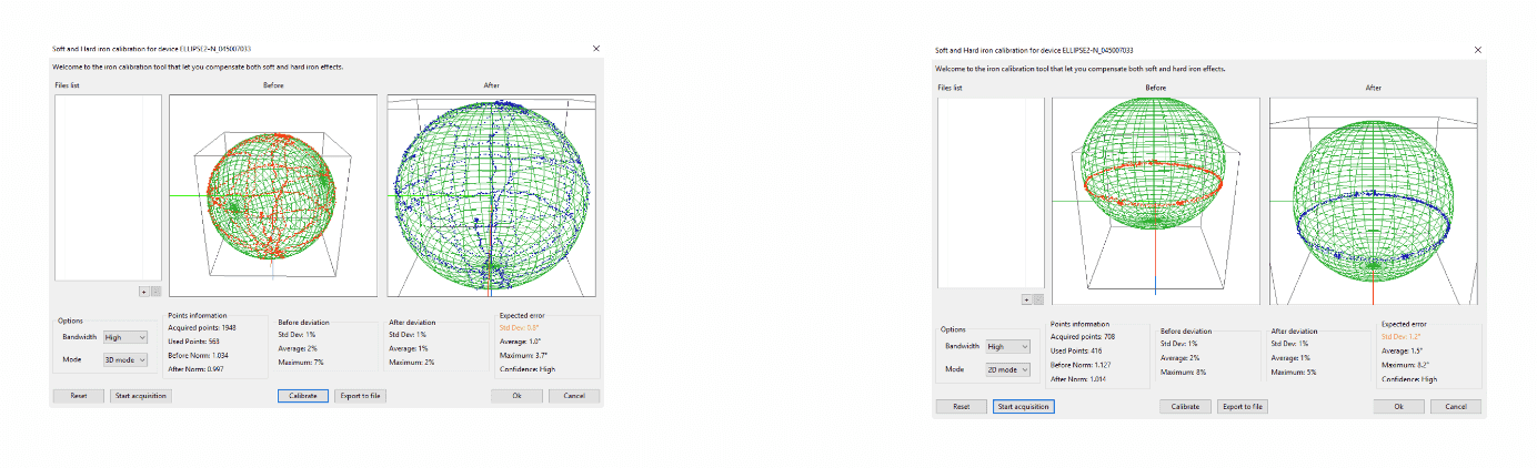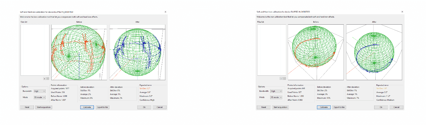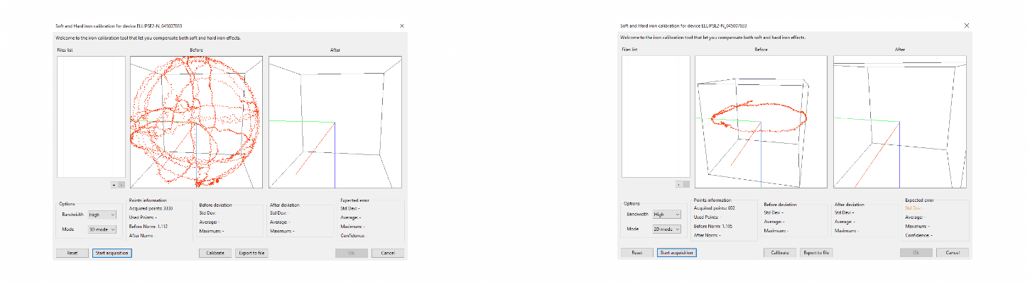 - 第一个“之前”显示 3D 中的所有点,因为它们是在任何硬/软铁校准之前由磁力计测量的。该显示是实时更新的。
