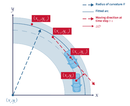 曲率半径会立即反映车辆转弯的车程度。在恒定速度和恒定角速度的情况下,例如在环形交叉路口中,曲率半径将很容易与环形交叉路口半径进行比较。