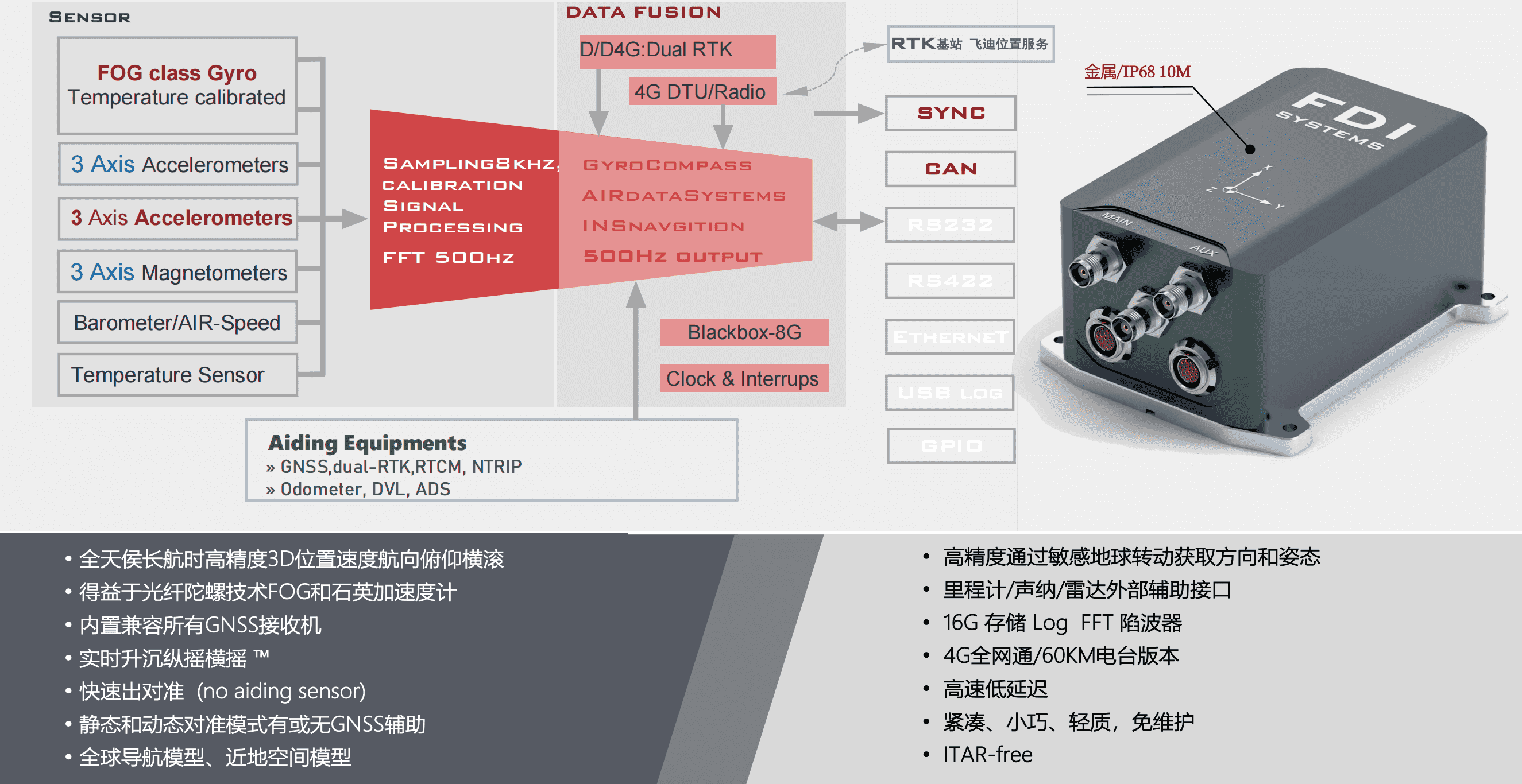 Orion5系列产品的传感器包含三轴光纤陀螺仪、三轴石英加速度计、磁力计、大气压强计以及温度计,具有一个强大的Sigma Point卡尔曼滤波器(SPKF),以及一套精准模型的紧(Tight)组合导航算法,高达8000Hz的传感器采样频率和圆锥和划船运动补偿,在线的估计传感器的误差,识别野值和测量异常并隔离故障,可以检测结构化的磁场并补偿,具有抗磁干扰能力。FDISYSTEMS的行业领先的算法提供高精度的位置,可方便的接入外部视觉、声纳/雷达等速度、位置、航向辅助设备进行组合导航。Orion5系列产品为用户针对应用领域提供额外的优势,用户可自主配置系统内置的动力学模型,通过界面软件进行模型参数的调整,进一步提高导航的精度和稳定性。