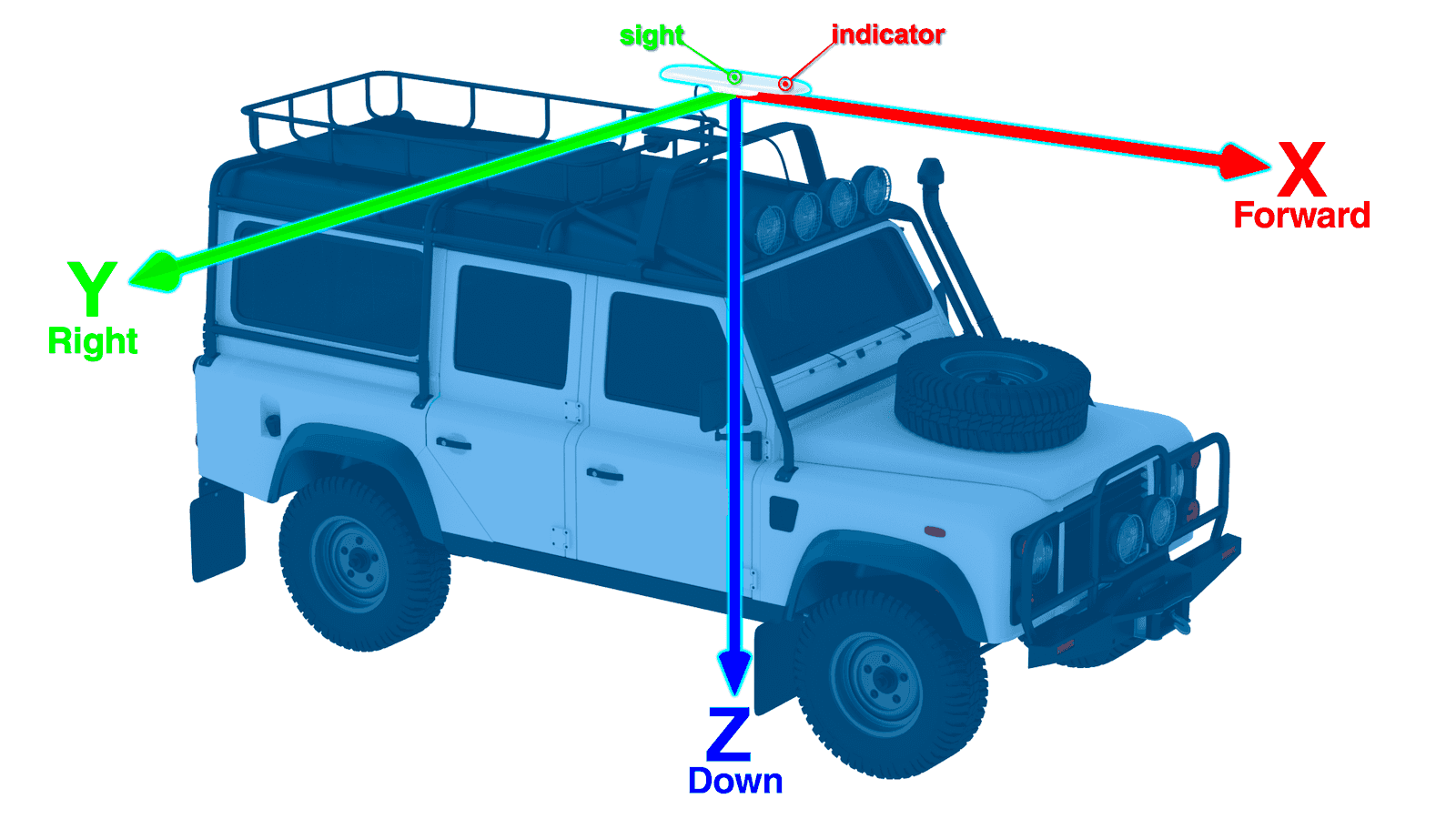 安装该装置,使X+轴向前指向车辆前部,Z+轴直向下指向地面,如下图所示。