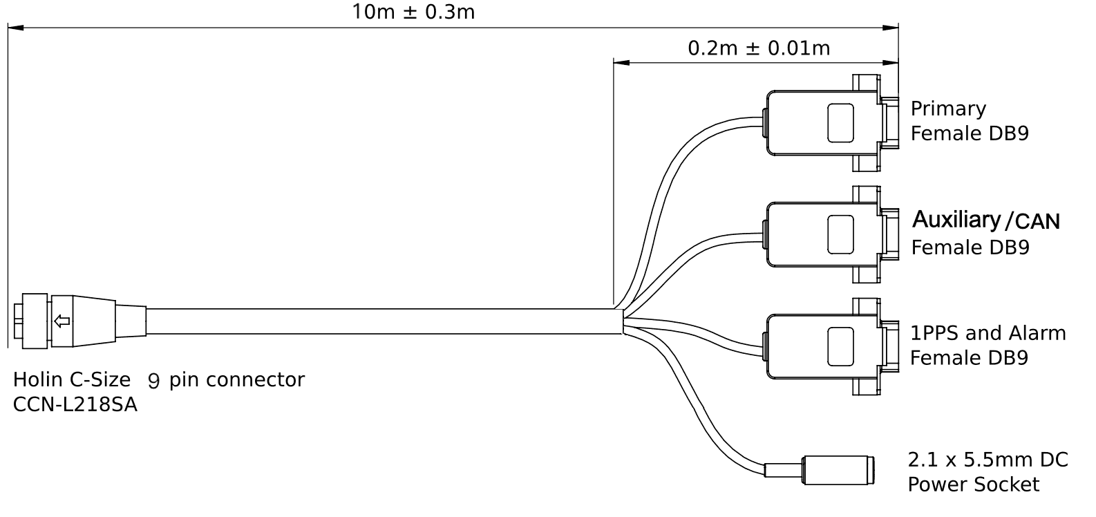 串行连接用于提供电源和访问一系列接口连接。可以通过串行未终止电缆、串行突破电缆或构建自己的电缆来实现(请参阅自定义串行终止)。连接通过Holin C-Size 9针连接器进行。 串行分断电缆